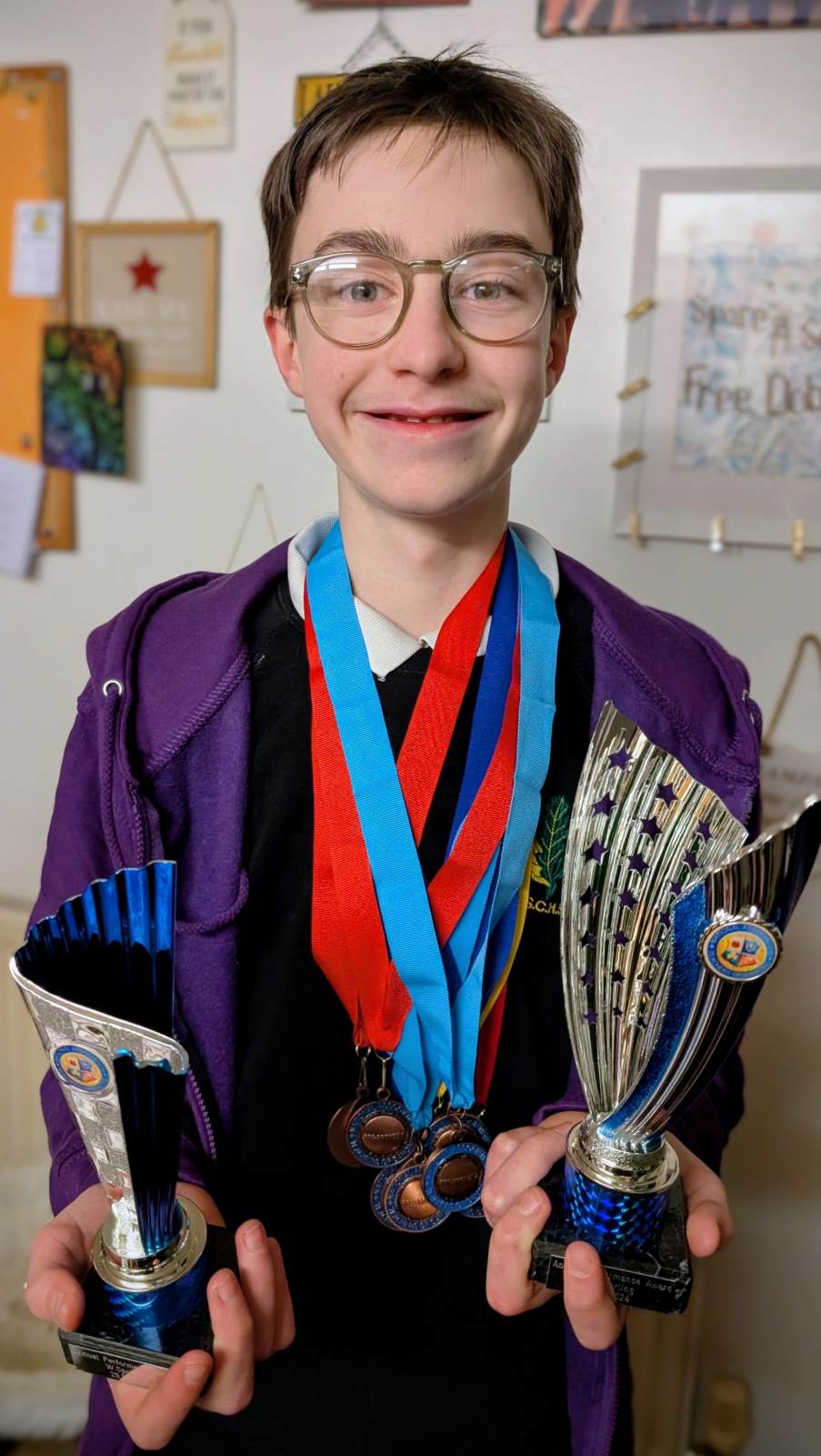 His hard work and dedication has clearly paid off as he recently received many medals and trophies (see photo).